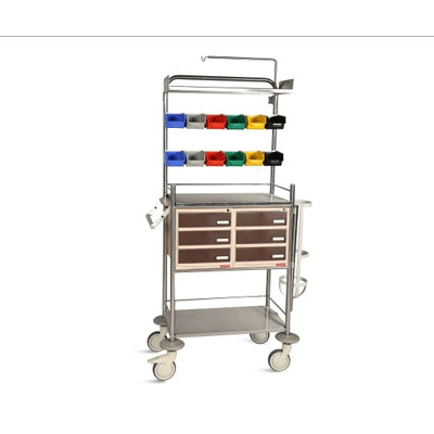 Complete with corner buffers, powder coated oxygen cylinder holder, catheter holder, cardiac massage board, SS IV pole