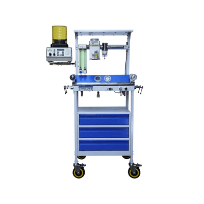 The machine has a rigid electrostatically powder-coated structure and also available in full stainless steel Provision for mounting 4-pin index type cylinders two each for Oz and N2O Option for 3-tube as well as 5-tube cascade type Rota-meters Hypoxia guard or oxygen ratio controller is provided as standard to ensure 25% oxygen delivery is always maintained in breathing circuit Machine has pneumatically driven and microprocessor controlled anesthesia ventilator with all basic functions to be used in OT Circle absorber of Twin chamber incorporated Changeover from open to close circuit provided.